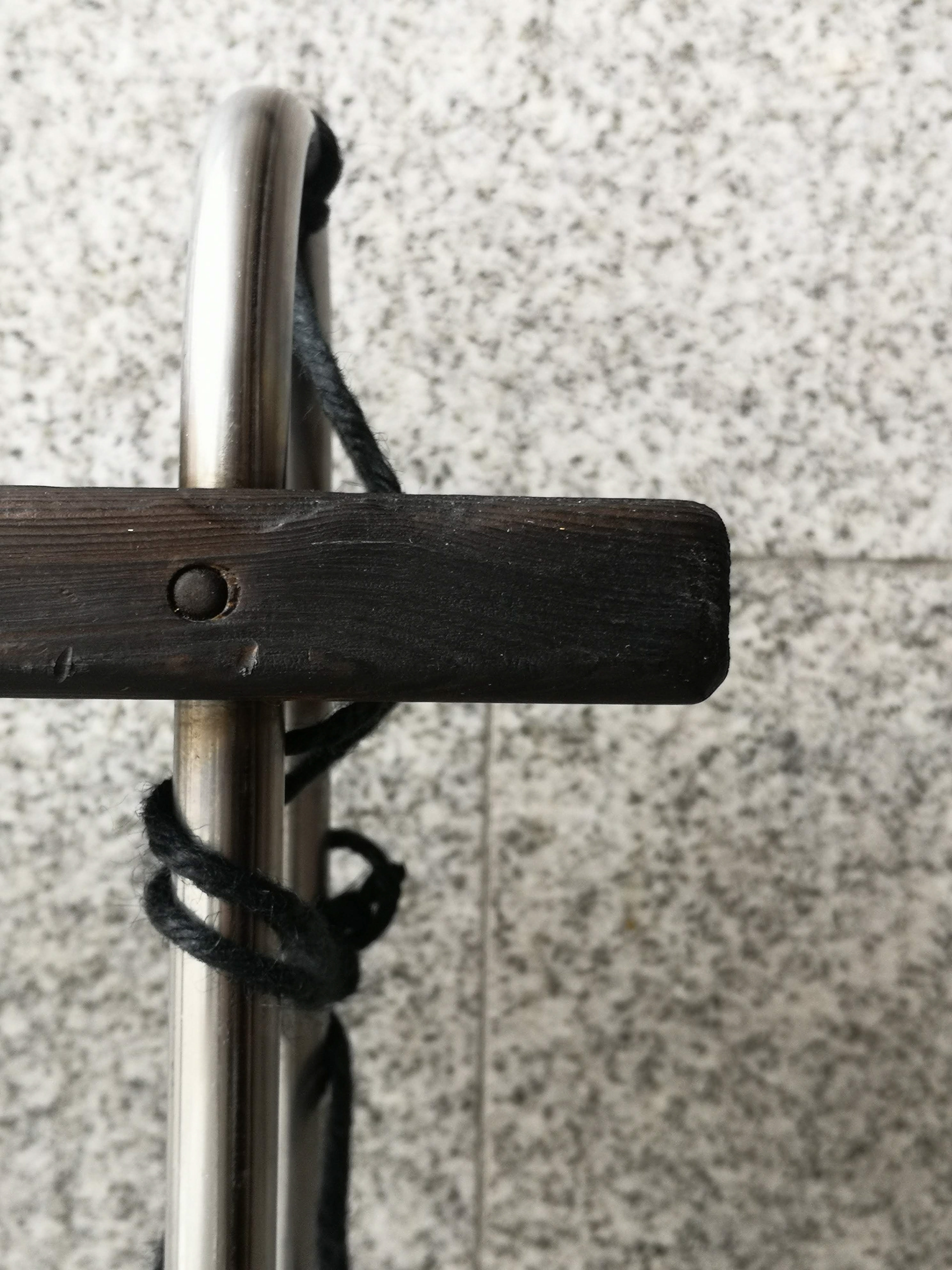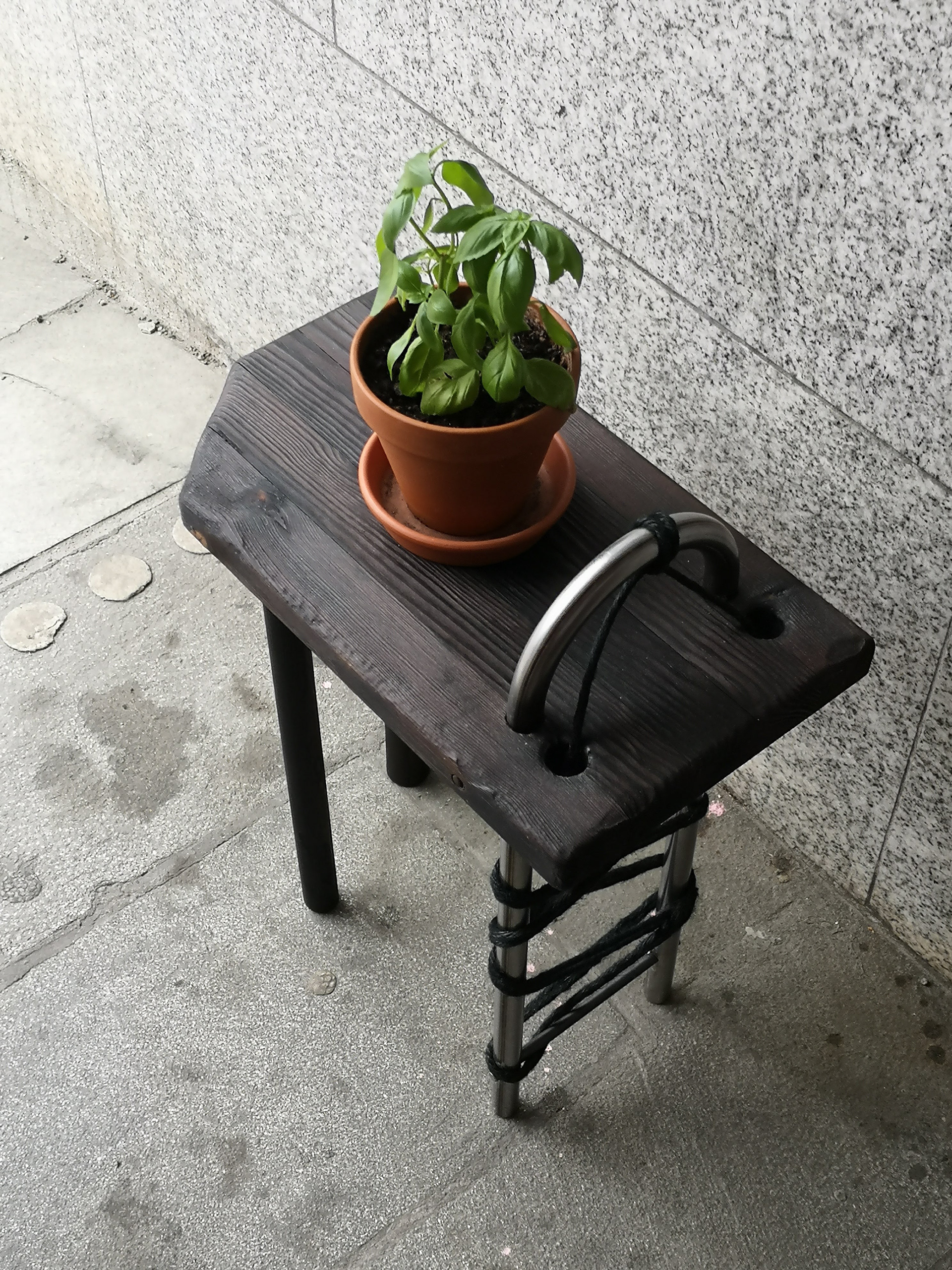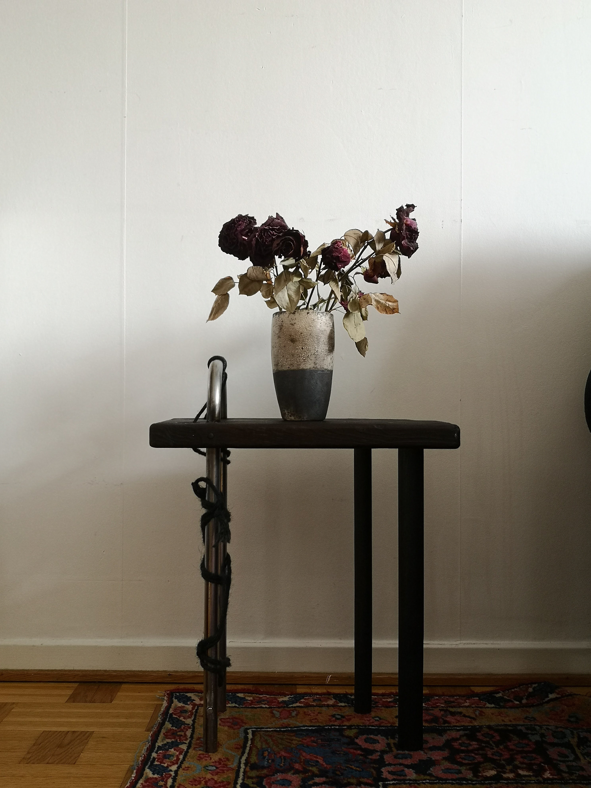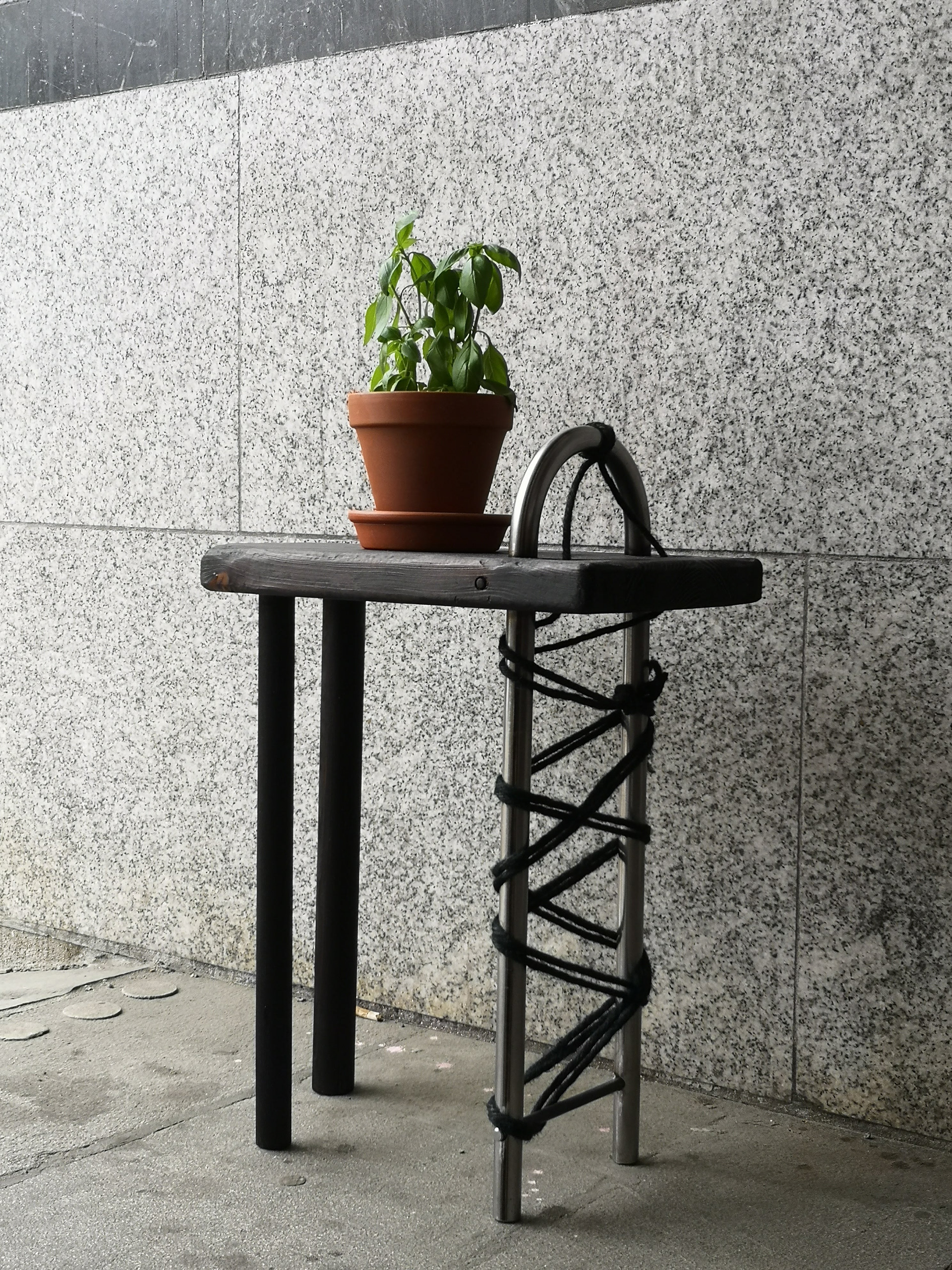 Burnt pine, steel, jute.